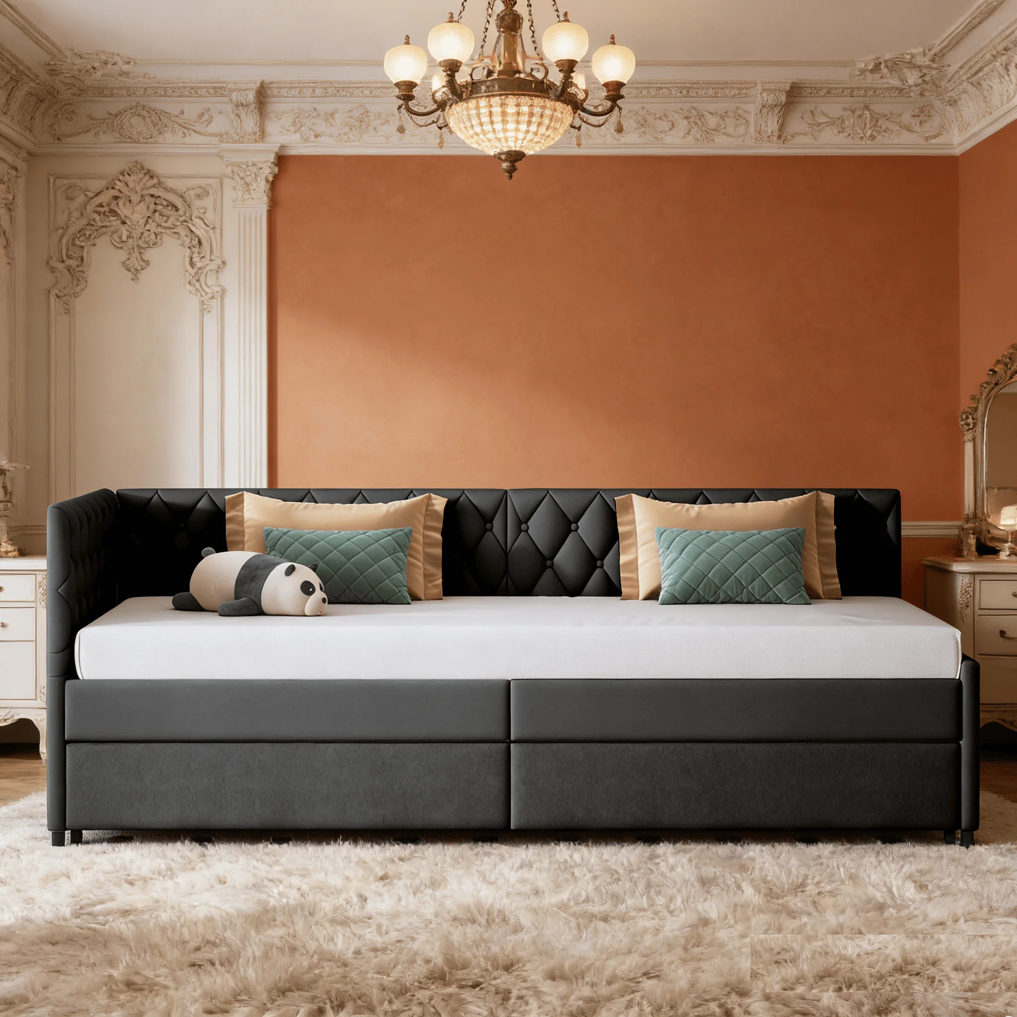 This double sofa bed offers two adjustable size modes: 90/180 x 200 cm. When used as a sofa, the 90 cm width saves space, making it ideal for small living rooms or study corners. When guests stay overnight or a bed is needed, it effortlessly slides out to 180 x 200 cm, instantly transforming into a spacious double bed that comfortably accommodates two people. It flexibly adapts to various living scenarios.