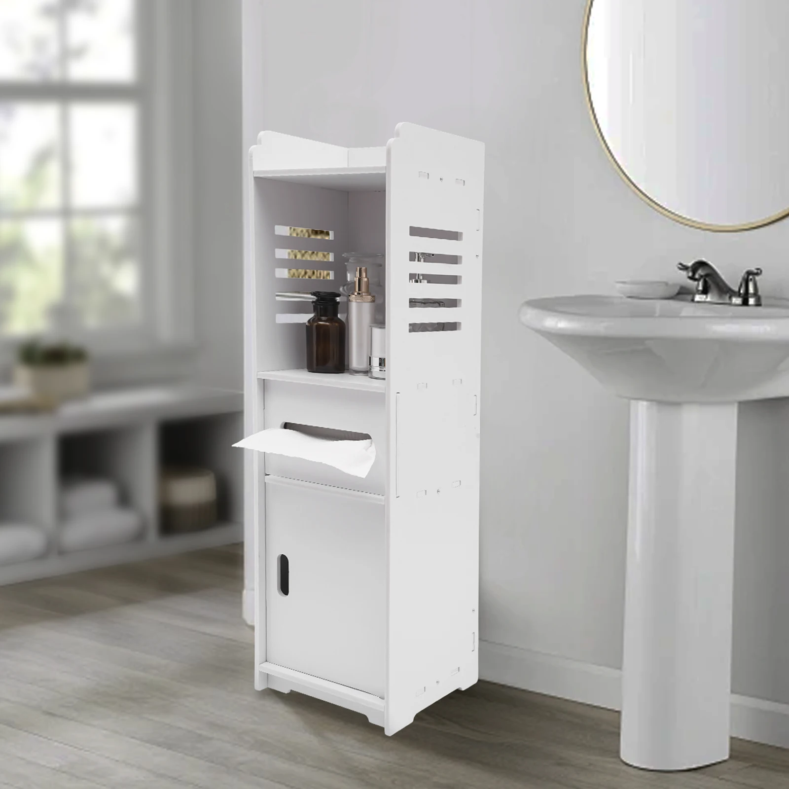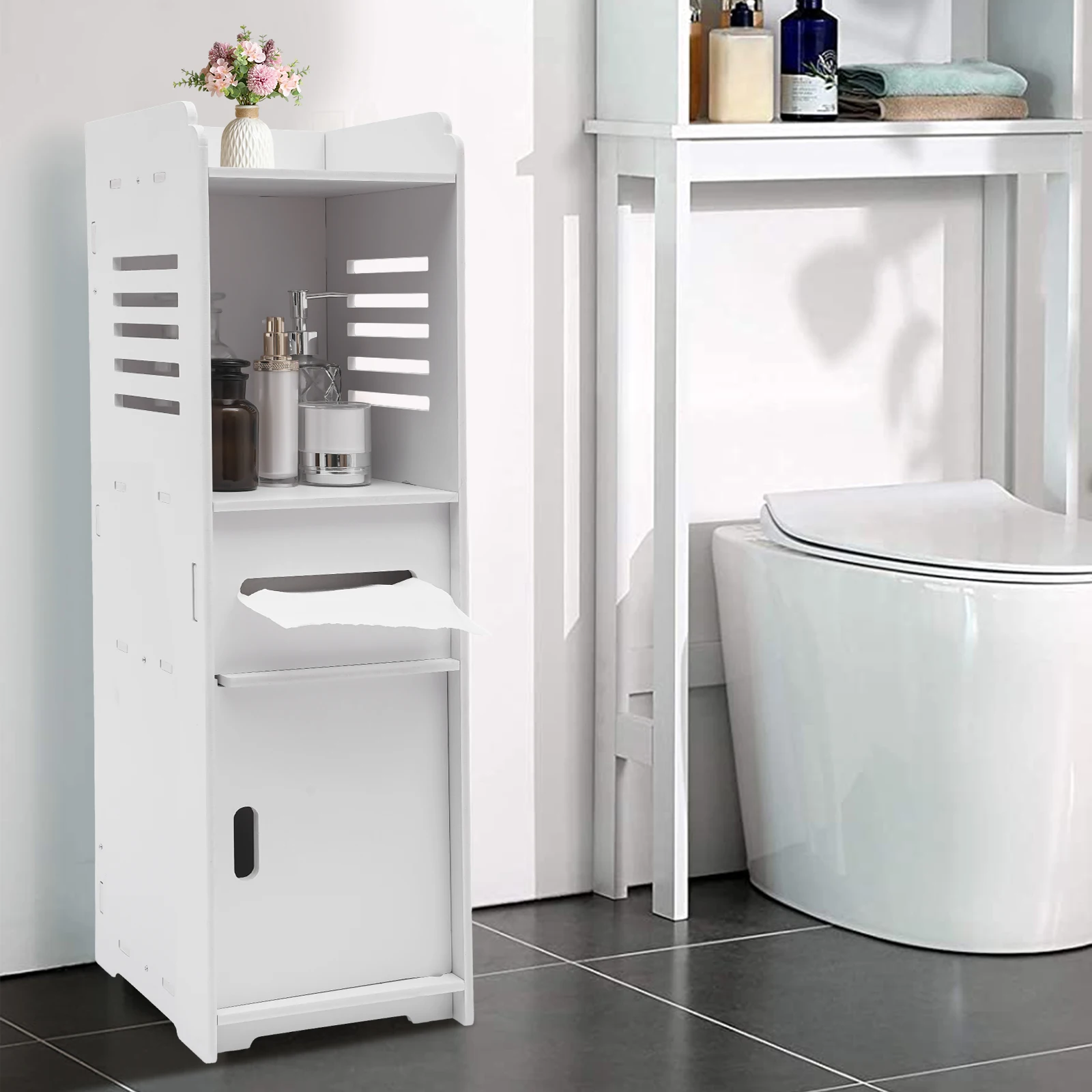 User-friendly Design: The tissue placement tier has a horizontal sliding door and a tissue opening to make tissue extraction and storage quick and easy. The bottom cabinet door has a cut-out handle design for easy opening and closing.