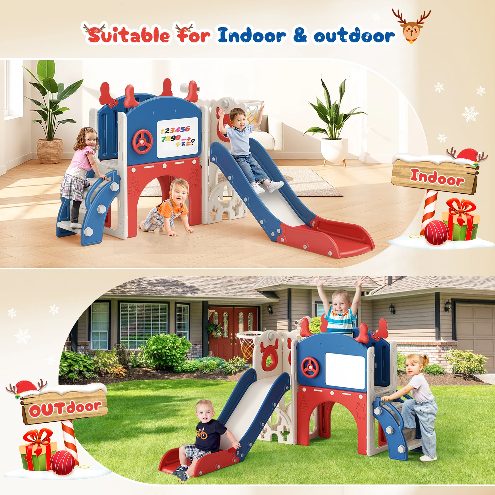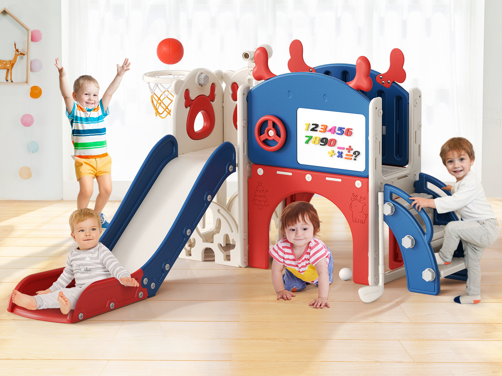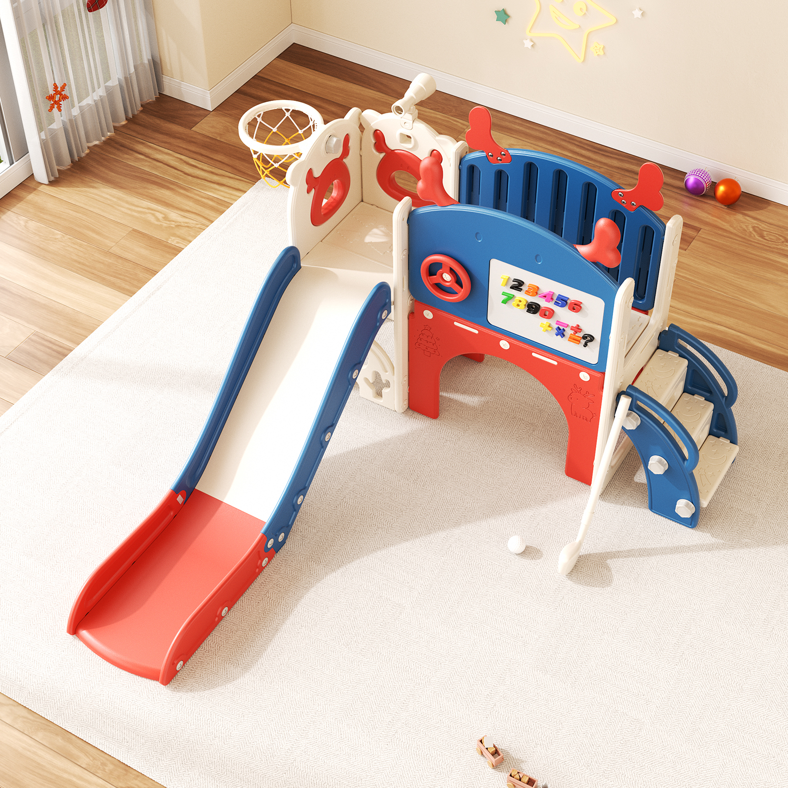 6-in-1 Toddler Slide Set – All-in-One Fun: This set includes a thrilling slide, a golf set with 2 balls, a drawing board with a brush eraser, a steering wheel, a climbing ladder, an arch, a toddler basketball hoop, a telescope, a set of number magnets and 1 convenient storage spaces for toys. Perfect for encouraging fitness, balance, and social skills while delivering endless fun!