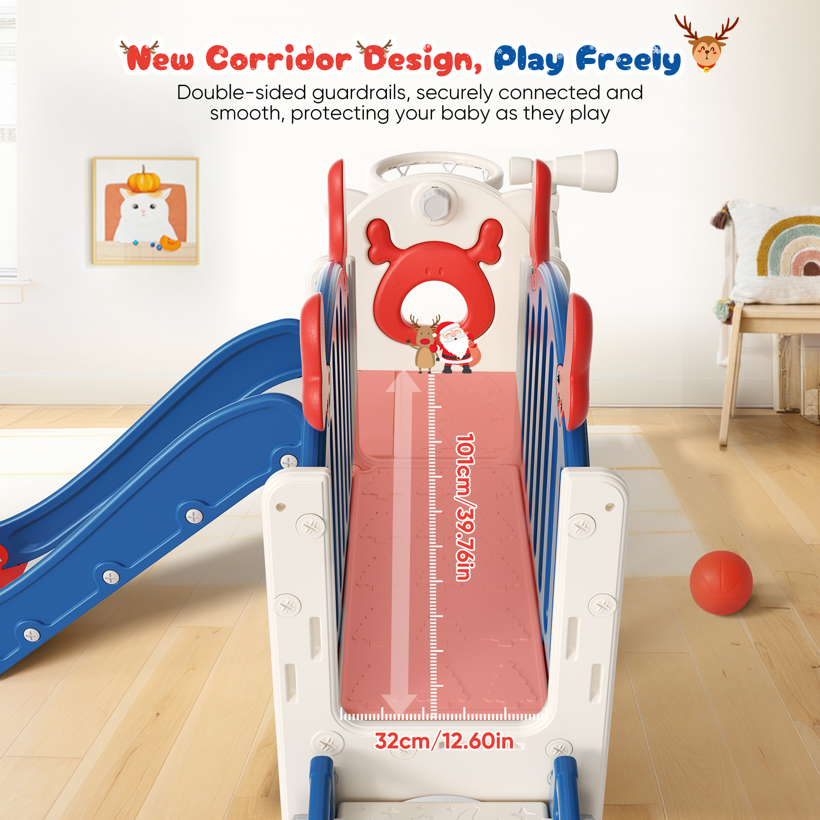 Safe & Fun Sliding Experience: Our slide for toddlers (ages 1-3) is engineered with safety in mind. With three distinct sliding zones – acceleration, deceleration, and buffer – it ensures a smooth and secure slide every time. The fully enclosed ladder features non-slip, wide steps and raised handrails to prevent falls, giving your child the protection they deserve while they play.