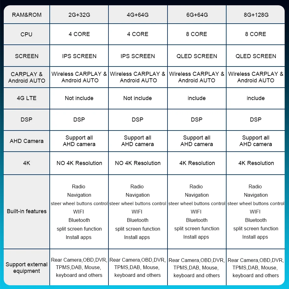 • Special Features: Built-In Speaker/Microphone,wifi function,Support 3G Network,Support 4G Network,Support Can-Bus,Built-in GPS,Charger,Mobile Phone,MP3 players,dsp,CarPlay,android auto,Reversing Input,Support steering wheel control