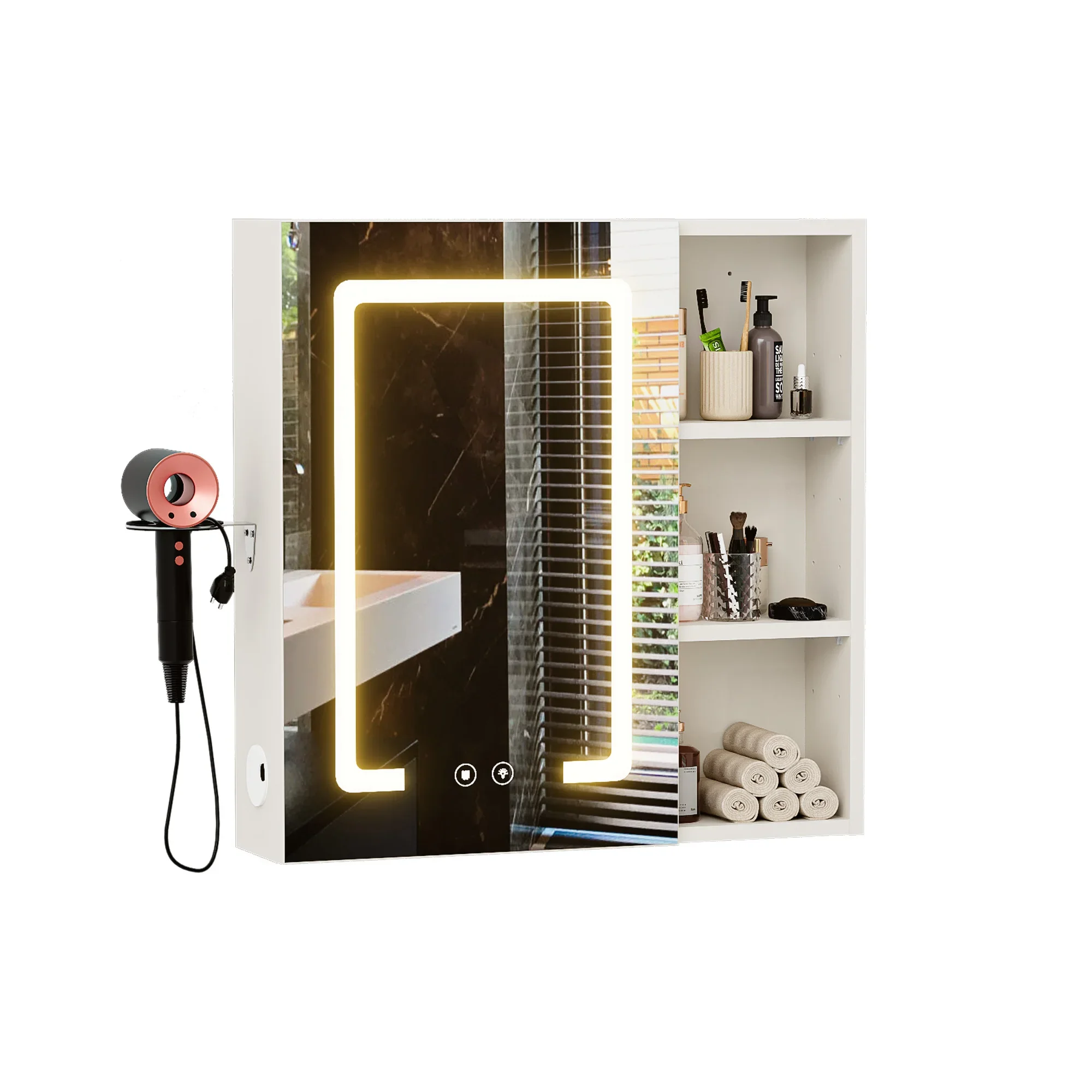 Convenient Hair Dryer Holder: Our practical dryer holder keeps your styling tool accessible yet neatly stored. It securely holds most standard hair dryers, eliminating counter clutter while protecting your appliance. This smart addition completes your organized, functional bathroom space.