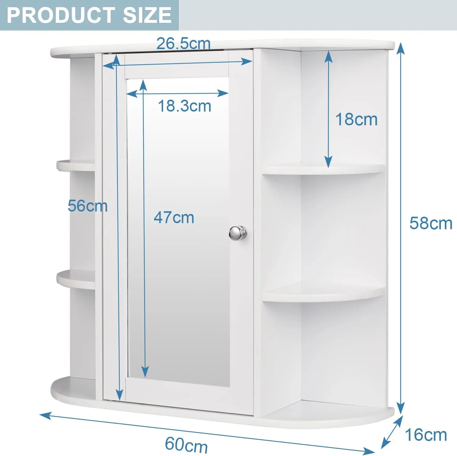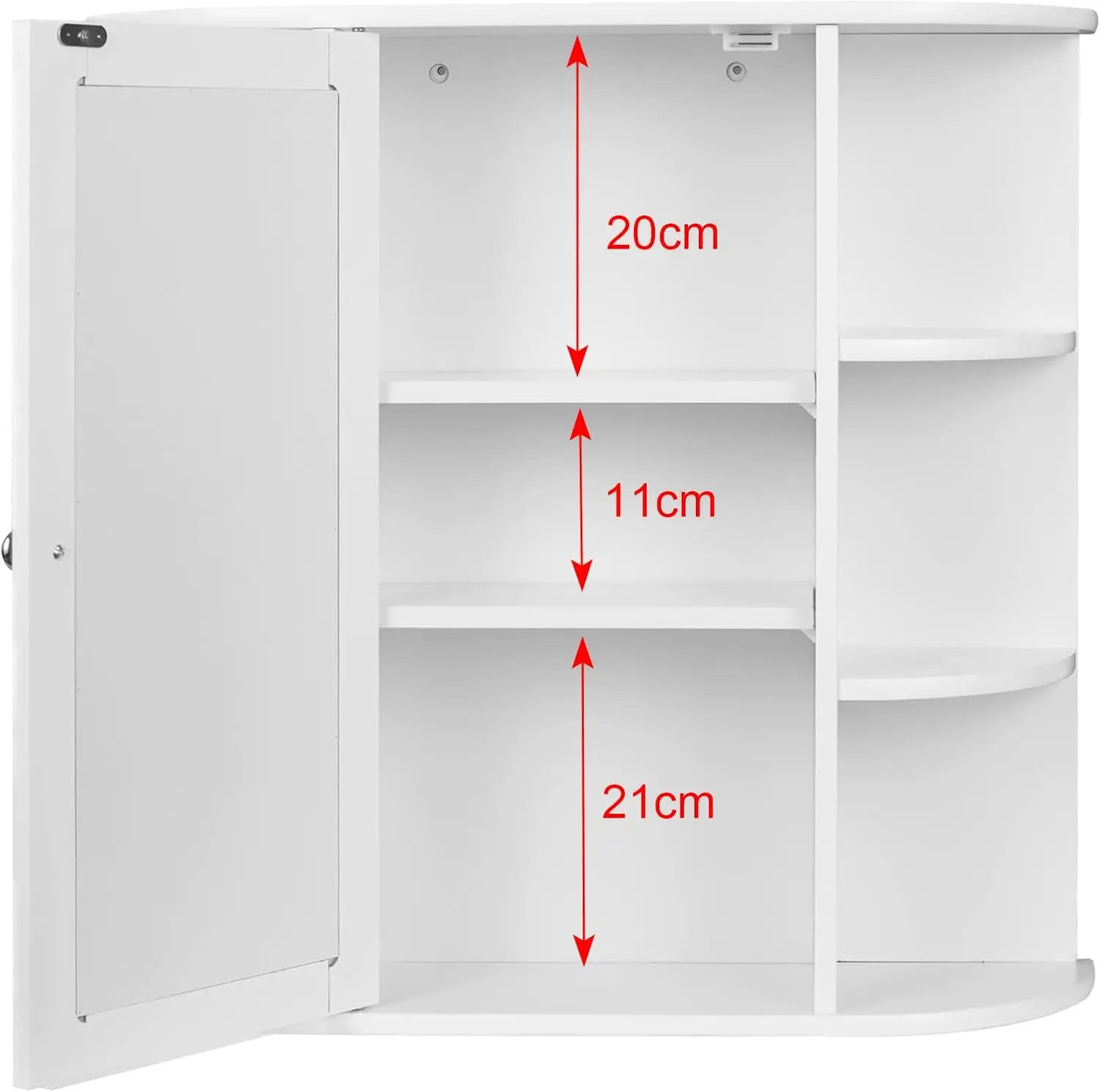 Mirror Cabinet with adjustable shelves: 2 tablets are adjustable from 6.4 cm to top/stockings for objects of different sizes. With a handle, the door is easy to open and close, which protects security and clean items