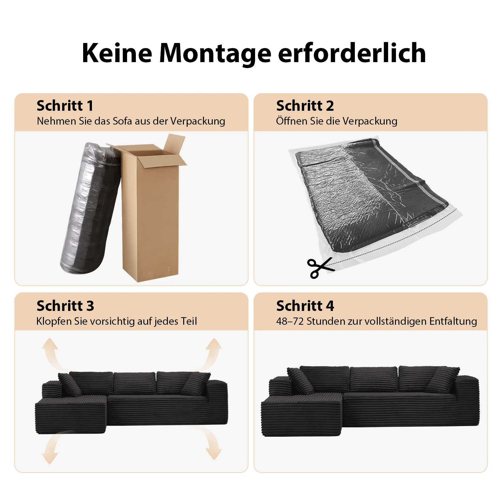 No installation and no effort-Forget tools and complicated instructions. This sofa comes vacuum compressed-simply unpacking, lightly tapping each section and waiting 48-72 hours for it to fully expand. The build-up has never been so effortless.
