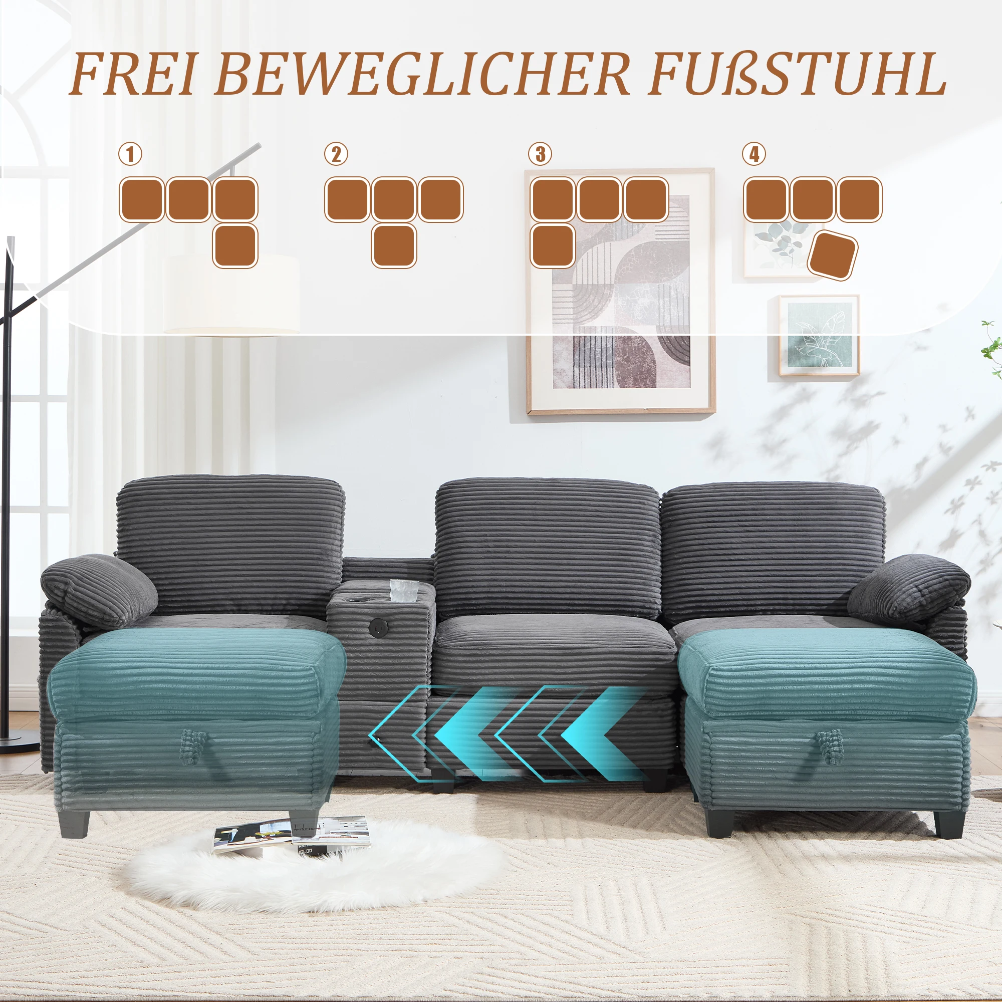 Comfort thanks to Memory Foam – The combination of high-density foam and Memory Foam ensures a perfect balance between softness and recovery, ideal for long sitting and relaxing. Practical side pockets – Integrated pockets on the sofa side provide space for magazines, remotes or tablets. So you have everything at hand and your living room remains neat. Movable center console – The flexible console offers two beverage holders, a convenient storage compartment and a drawer. It can be moved to suit your seating position or needs. USB-Type-C connector – Thanks to the integrated USB-C connector, smartphones, tablets or other devices can be charged directly from the sofa – perfect for modern households. Flexible storage stool – The supplied stool offers additional storage space and can be moved flexibly. Use it as a footrest, seat or storage area. Stable construction – The solid frame ensures high load-bearing capacity and durability. The stable structure makes the sofa a safe companion for the whole family. High quality cord cover – The soft cord fabric feels comfortable on the skin and gives the living room a cozy, stylish atmosphere. The material is durable, easy to maintain and durable. Multifunctional design – Whether for cosy TV evenings, relaxed reading or social rounds: the sofa is versatile and fits perfectly into different living styles.