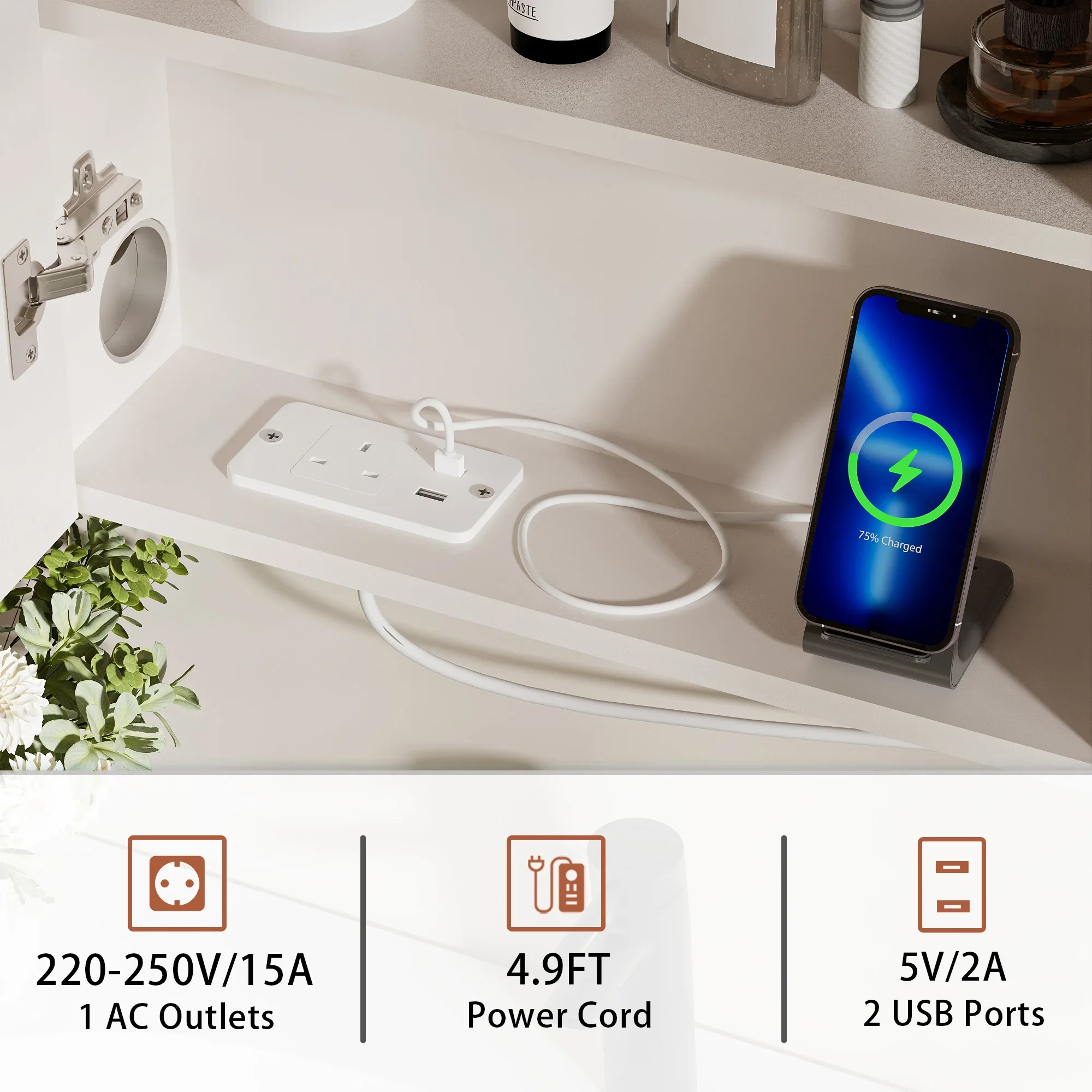 Wall-Mounted: Designed for easy installation with all mounting hardware included, our space-saving cabinet mounts flush to your wall. The innovative design incorporates a dedicated hair dryer holder for convenient access and storage.