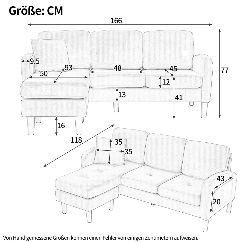 1.Modular design: The sofa can be assembled flexibly, with a chair length that can be arranged either left or right, to adapt to different room configurations. 2.Comfortable padding: The soft padding provides excellent seating comfort and is perfect for relaxing and lying down. 3.Ideal for small spaces: With the compact dimensions of 166 x 118 x 77 cm, this sofa fits easily into smaller living rooms, apartments and offices without sacrificing comfort. 4.Breathable fabric: The cotton-linen blend fabric cover provides excellent ventilation and remains pleasantly fresh and cool even on hot days. 5.Robust construction: Thanks to the stable frame and plastic legs, the sofa is particularly durable and resistant. 6.Flexible Chair Length: The Chair Length can be used as additional reclining area or seating area as required, making the sofa versatile to use. Easy assembly: The sofa can be assembled quickly and easily – the modular design allows for easy and fast assembly, even without additional help.