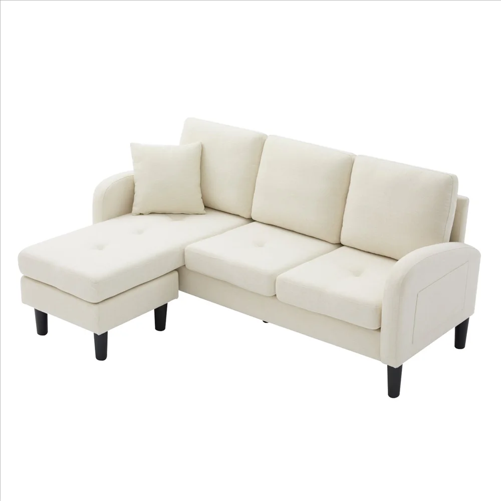 This L-shaped corner sofa with chaise lounge combines modern design and functionality, ideal for small and medium-sized spaces such as living rooms, apartments or offices. It offers comfortable space for up to three people and convinces with a practical modular construction. The sofa consists of a two-seater module and a flexible armchair that can be arranged on either the left or right side, depending on your room layout. The breathable cotton-linen surface ensures excellent ventilation and always remains pleasantly cool and comfortable. The soft upholstery offers first-class comfort for sitting and lying, while the sofa fits perfectly into smaller spaces thanks to its compact size of 166 x 118 x 77 cm, without sacrificing space and functionality. The sofa is particularly durable and stable thanks to its stable plastic legs and robust frame. With a simple assembly process and additional cushion for even more comfort, this sofa is the ideal solution for modern, functional living rooms that are stylish and comfortable at the same time.