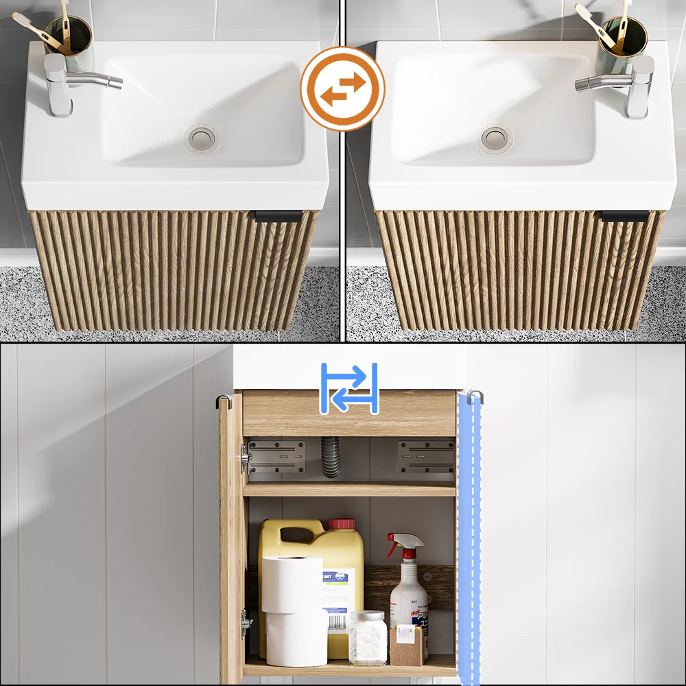 Easy Installation: Designed for hassle-free assembly, this vanity sink includes 4 right-angle corner braces and clear instructions for quick setup. The reversible hinge system lets you choose whether the door opens to the left or right, accommodating different bathroom configurations. All necessary hardware is included, so you can install it yourself.