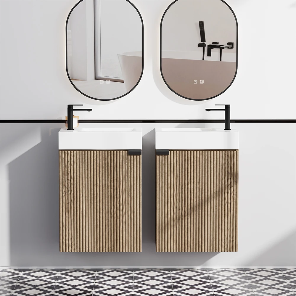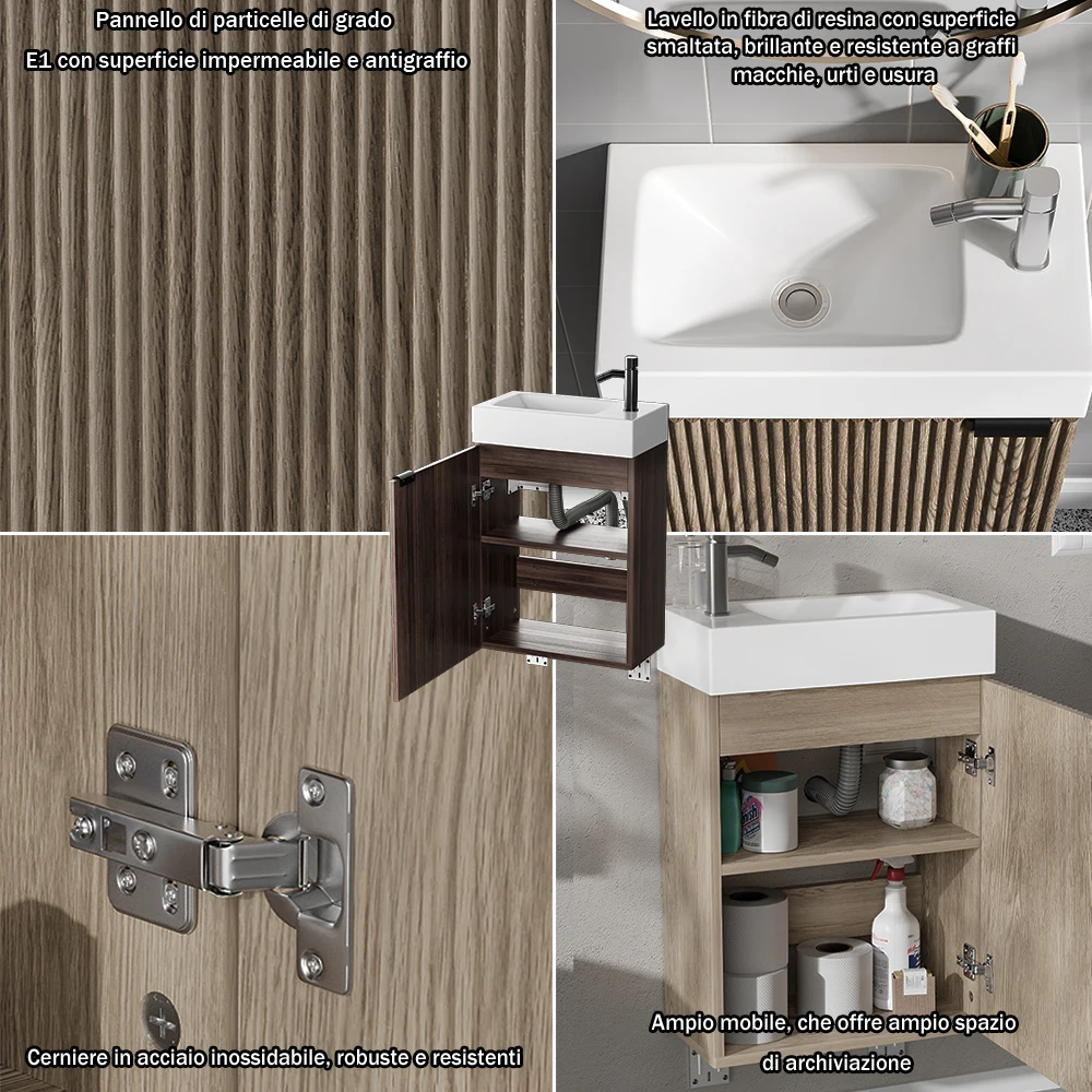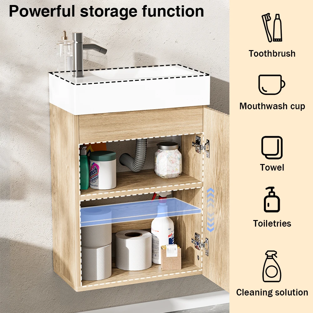 Space-Saving Storage: Ideal for small bathrooms, this compact vanity maximizes space. The spacious cabinet neatly organizes toiletries, skincare products, and cleaning supplies, keeping your countertop clutter-free. The slim profile fits snugly in tight spaces, while the wall-mounted design protects the cabinet from floor moisture. A practical and stylish choice for modern, space-conscious homes.