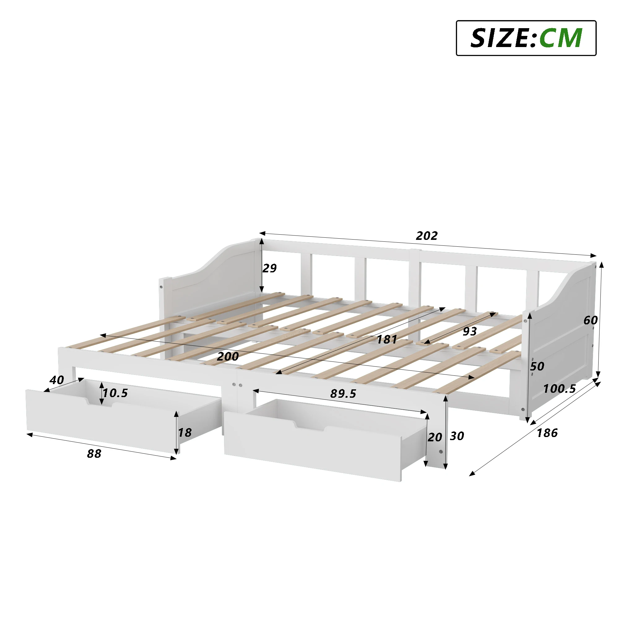 3. Platzsparendes Design – Das ausziehbare Bettgestell lässt sich leicht herausziehen und einschieben und spart so viel Platz. Ideal für kleine Räume, Apartments und Gästezimmer. Zwei zusätzliche Schubladen bieten Stauraum.