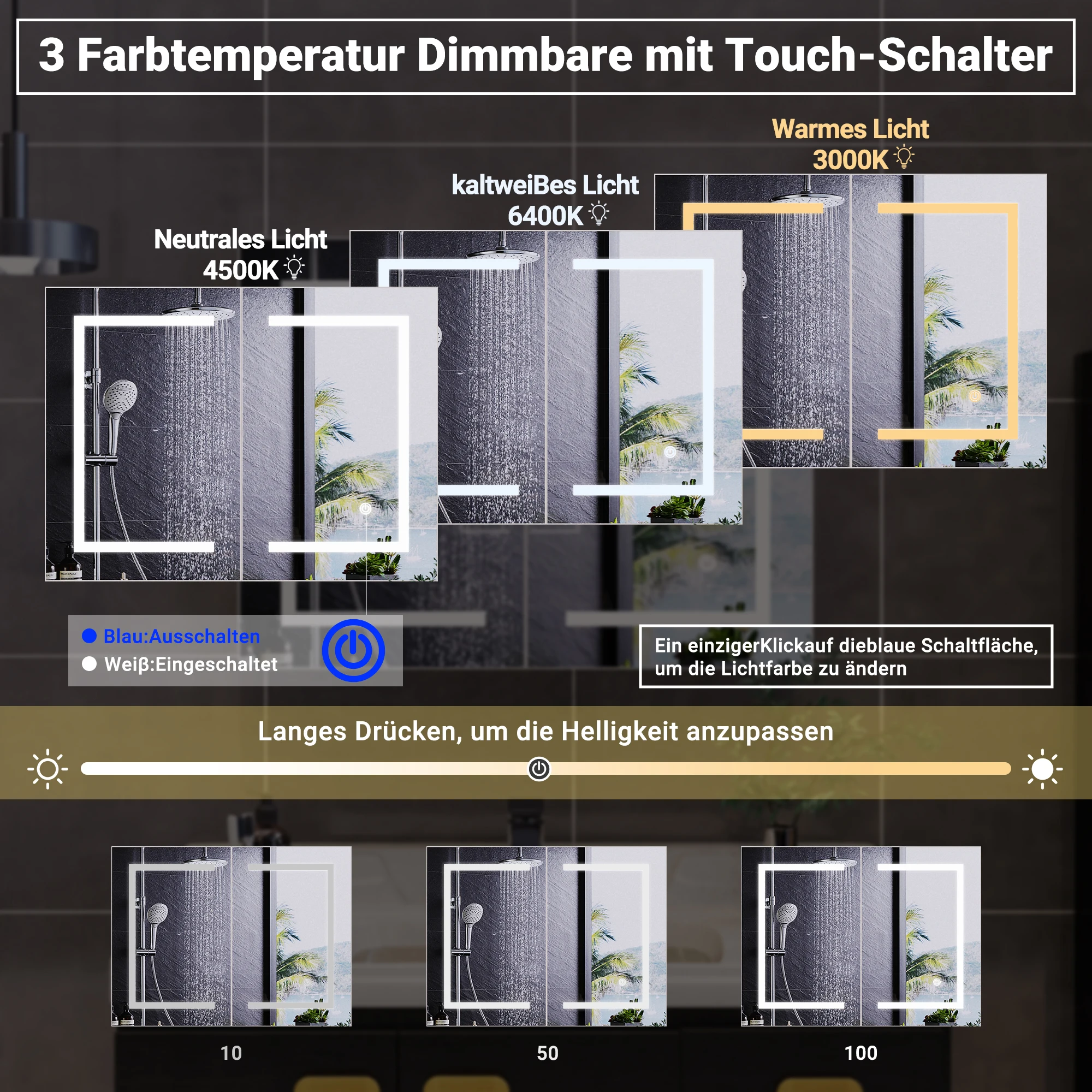 1.Mit LED-Beleuchtung: Badezimmer-Wandschrank mit Spiegel, hell und natürlich, einstellbare Helligkeit, drei Lichtfarben: kalt, warm, natürliches Licht, 3 Beleuchtungsmodi von 3000 K bis 6500 K stehen zur Verfügung. Berühren Sie einfach den blauen Schalter am Spiegel, um das LED-Licht einzuschalten. Drücken Sie kurz, um zwischen diesen drei Lichtarten zu wechseln, und halten Sie gedrückt, um die Lichthelligkeit anzupassen. Der blau leuchtende Knopf ist nachts gut zu erkennen.