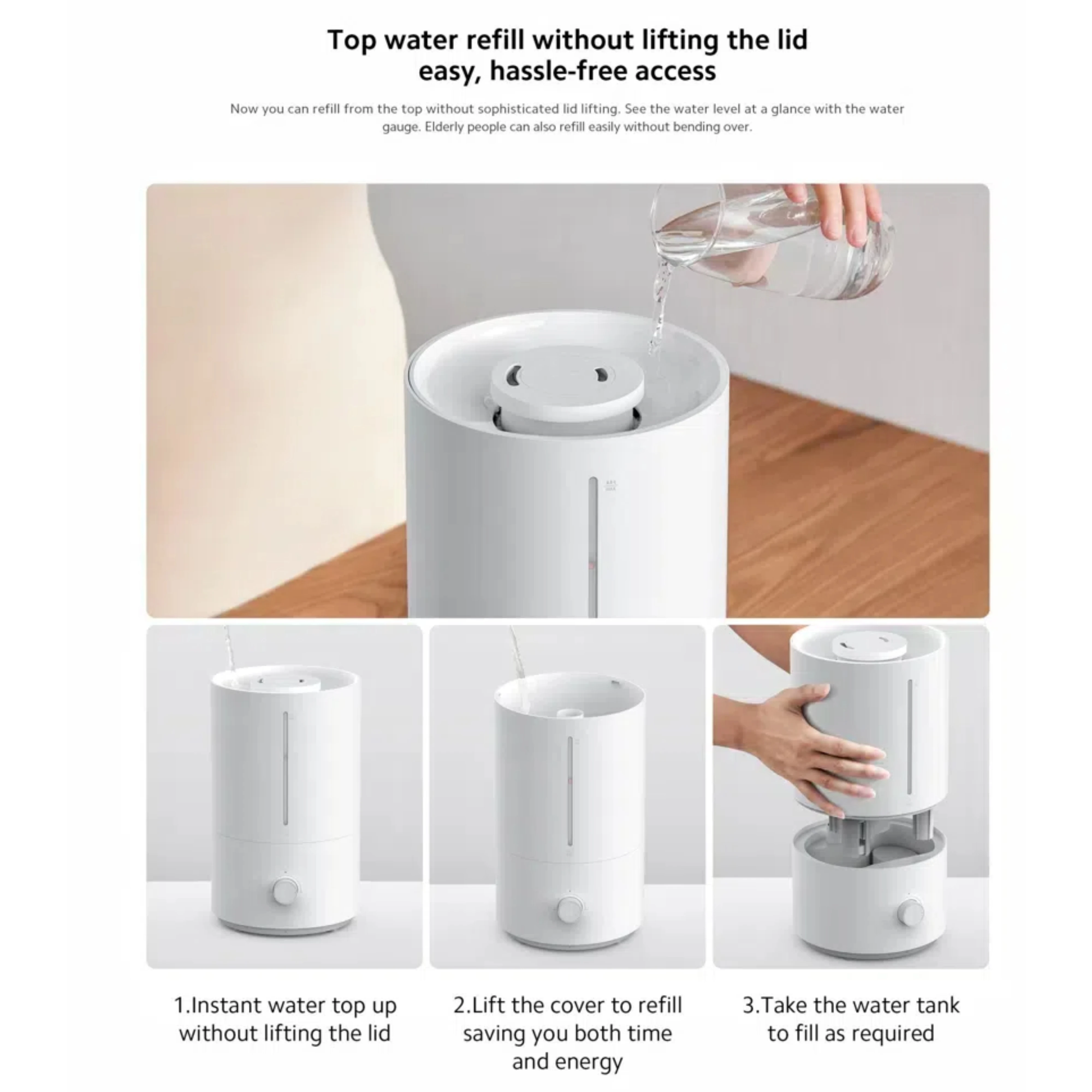 Allows for easy water refilling directly from the top without moving or turning the unit upside down.